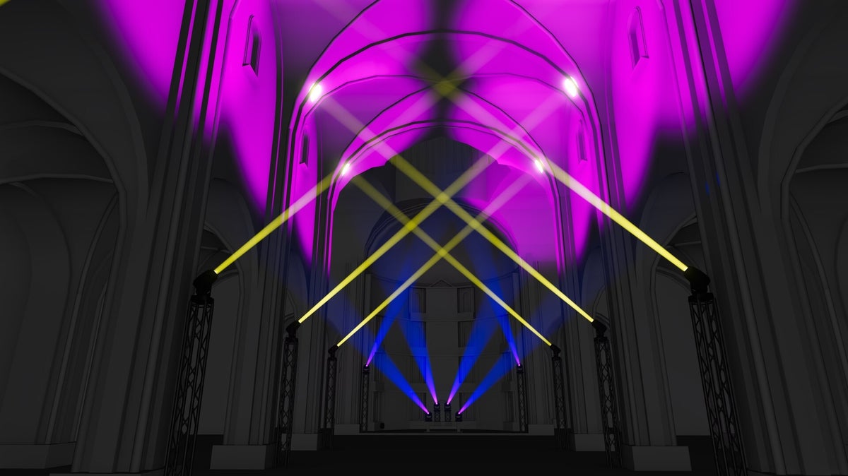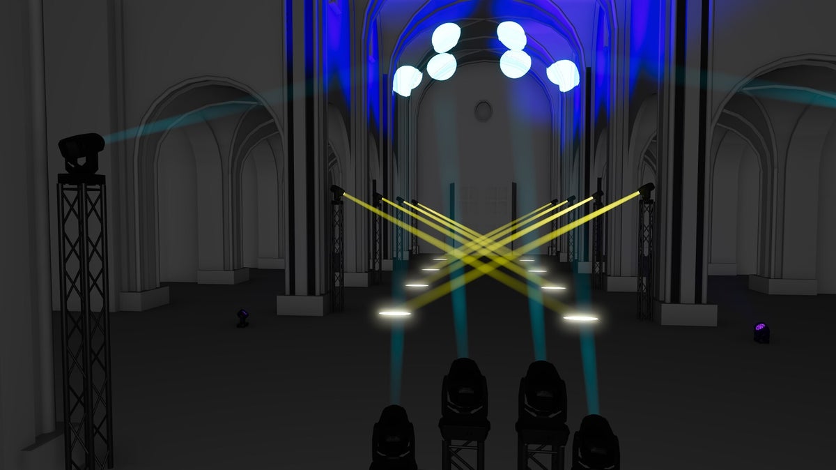 La instal·lació es compon de vuit pointers a cada columna de l'església i pointers a l'altar, amb un projector de 6k simulem l'efecte d'un làser on creem una escena que delimita l'espai de la ballarina a la de l'espectador.